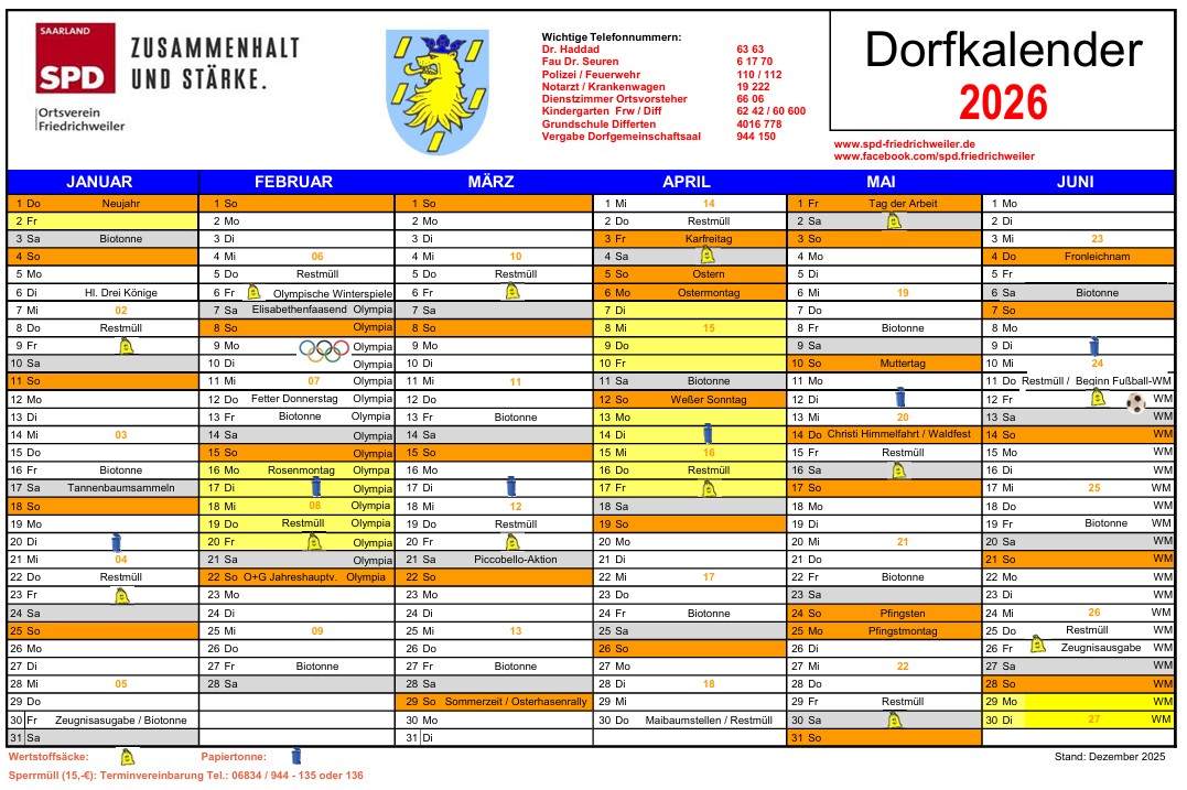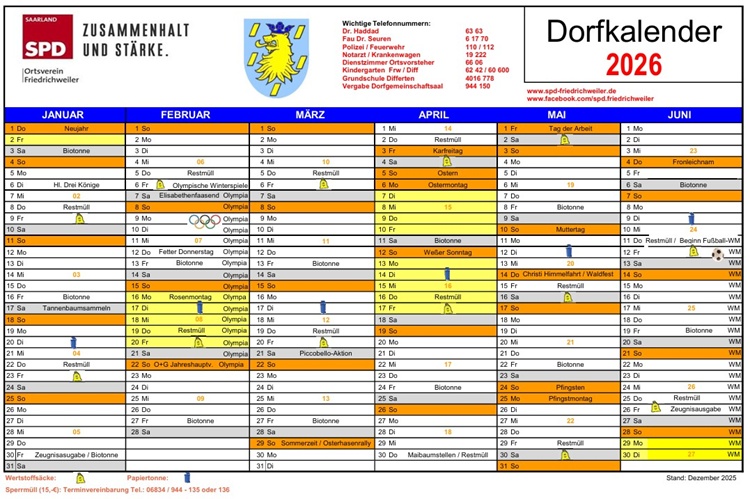 Wie jedes Jahr um die Weihnachtszeit erstellt die SPD den Dorfkalender von Friedrichweiler. 450 Exemplare wurden gedruckt und werden in den letzten Tagen des Jahres an die Haushalte verteilt.