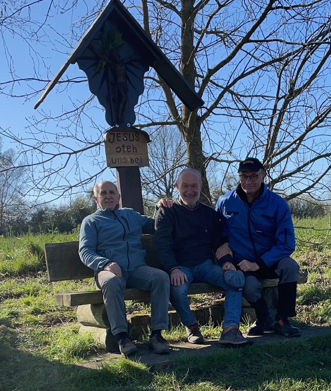 Morsche Holzteile hat Alfred erneuert, alte Farbreste entfernt und einen neuen Anstrich aufgetragen. Bei der Montage des renovierten Wegekreuzes wurde er von Manfred und Martin unterstützt.