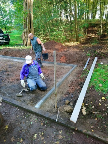 Nach den ersten Treffen der Interessenten der Bürgerwerkstatt zur Planung einzelner Projekte stand am vergangenen Samstag der erste große Arbeitseinsatz an. Als erstes Projekt haben wir uns vorgenommen, den Standort der Papiercontainer von der Straße weg in den hinteren Parkplatzbereich zu verlegen. Die Einfahrt ins Dorf soll dadurch ansprechender werden. In Eigenregie haben wir sogar den Aushub organisiert. Christian Mang übernahm mit seinem allradgetriebenen Massey Ferguson diese Aufgabe. Ein hartes Stück Arbeit. Derweil übernahm Alfred Müller, unser unermüdlicher Schaffer im Dorf, den Transport der Tiefbord und des Fertigbeton von Ensdorf nach Friedrichweiler. In einer starken Gemeinschaftsaktion wurde der Aushub vorgenommen, Beton gemischt und die Randsteine gesetzt. Beim Richtschnürespannen erhielt unser Navigator Unterstützung vom alte Pythagoras. Wer hätte es noch gewusst: a2 + b2 = c2
