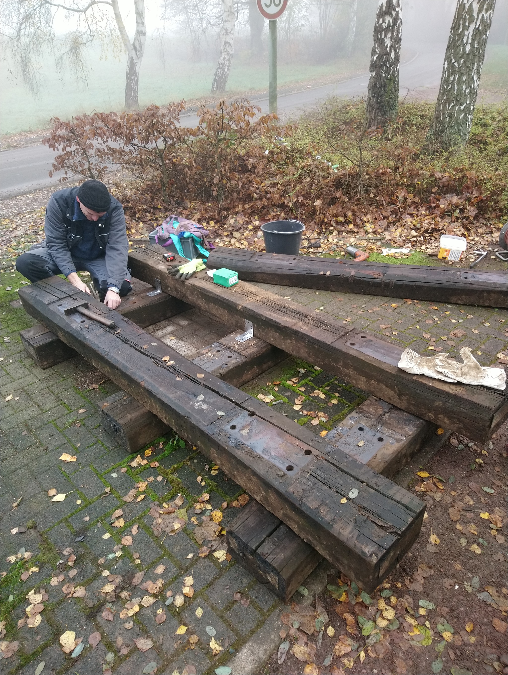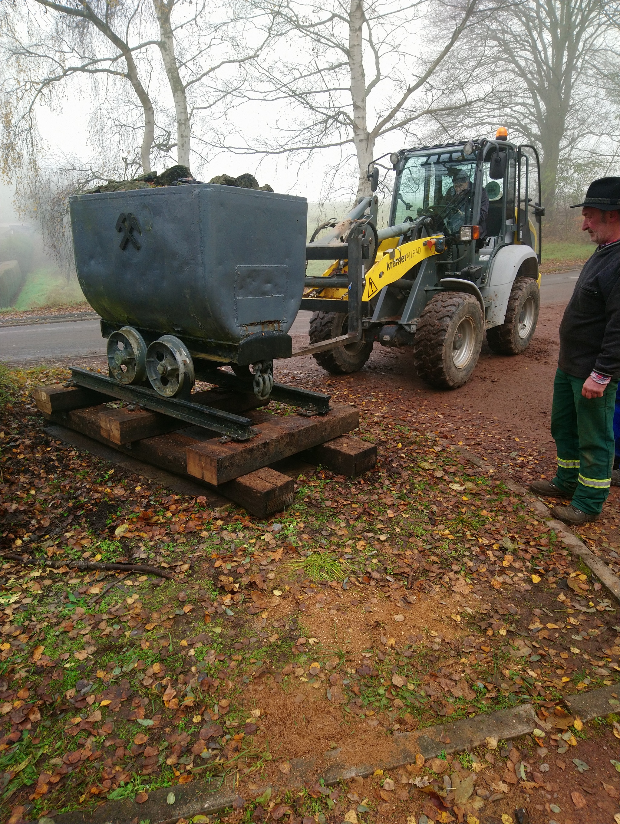 Am Ortseingang erinnert eine Lore an die Tradition des Bergbaus in unserer Region und besonders an deren Bedeutung für unser Dorf in der Vergangenheit. Die Schwellen der Lore haben über Jahrzehnte gute Dienste getan, aber sie waren mittlerweile doch sehr morsch. Neue Bahnschwellen konnten besorgt werden und wir machten uns an die Erneuerung. Der Zuschnitt und die Verankerung der Schienen erforderte neben einigem Geschick auch wichtiges Werkzeug. Zu unserer Rettung konnten wir auf die bewährten Schaffer Alfred und Christian zurückgreifen, die mit Know-how und dem richtigen Gerät für alles eine Lösung fanden.