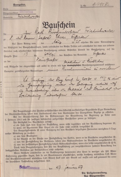 So folgte ein zweijähriger Briefwechsel zwischen der Kirchengemeinde, der damaligen Regierungskommission des Saargebietes und den Baubehörden, die mehrmals den Kirchenbau zum Scheitern zu bringen drohten. Schließlich wurde die Baugenehmigung am 27.01.1927 erteilt – gut ein halbes Jahr nach der Einweihung.