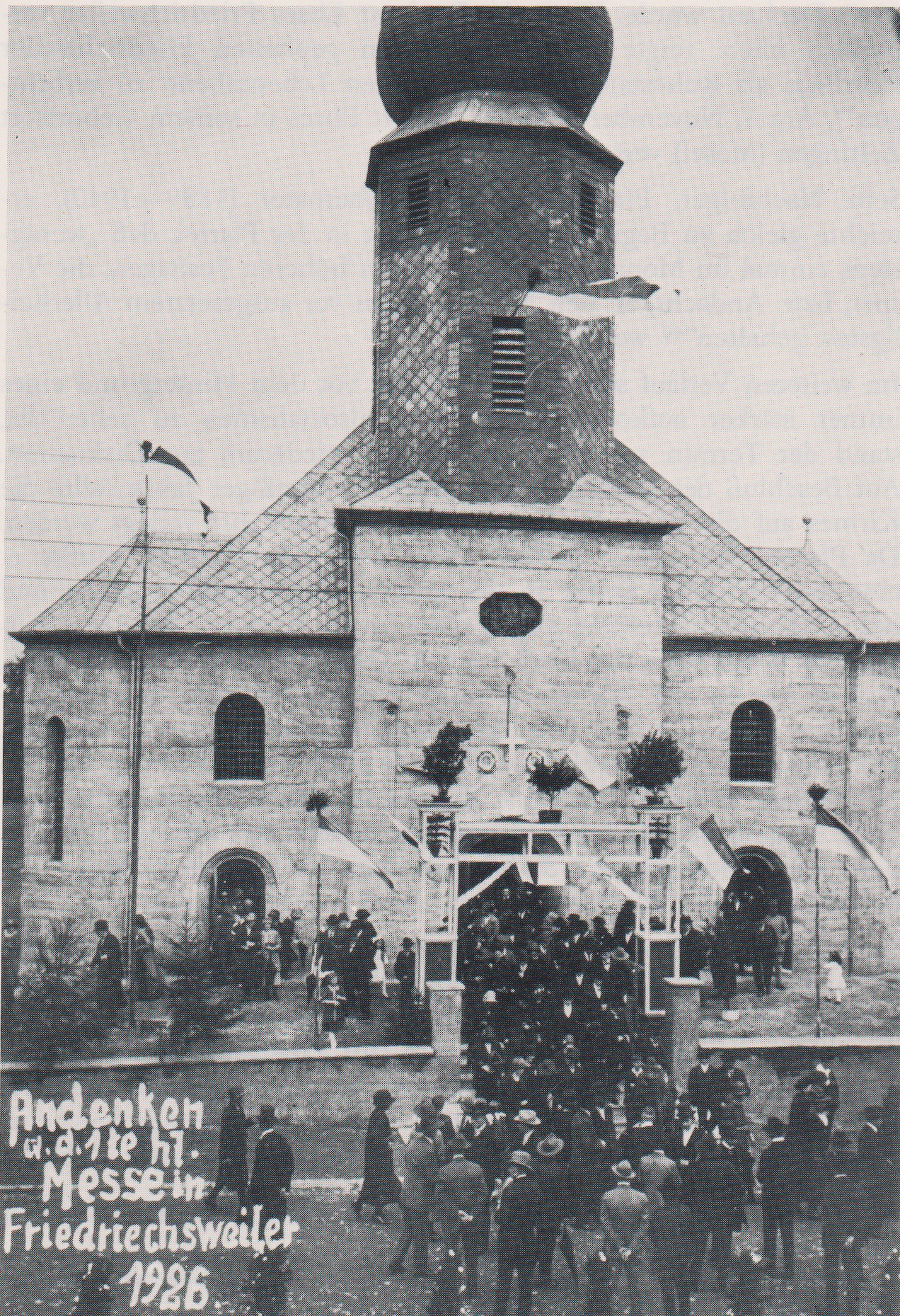 Am 30.11.1932 weihte Pfarrer Ehses das Denkmal für die Gefallenen vor der Kirche ein. Damit sollte das Andenken an die 12 Gefallenen des Ersten Weltkrieges aus Friedrichweiler aufrechterhalten werden.