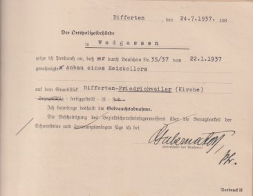 Am 24.07.1937 zeigt Pfarrer Gubernator bei der Ortspolizeibehörde Wadgassen an, dass der am 22.01.1937 genehmigte Anbau eines Heizkellers an der Kirche fertiggestellt ist.