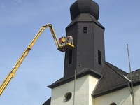 Schließlich konnte am 23.06.2010 die Installation der dreiseitigen Kirchturmuhr erfolgen.
